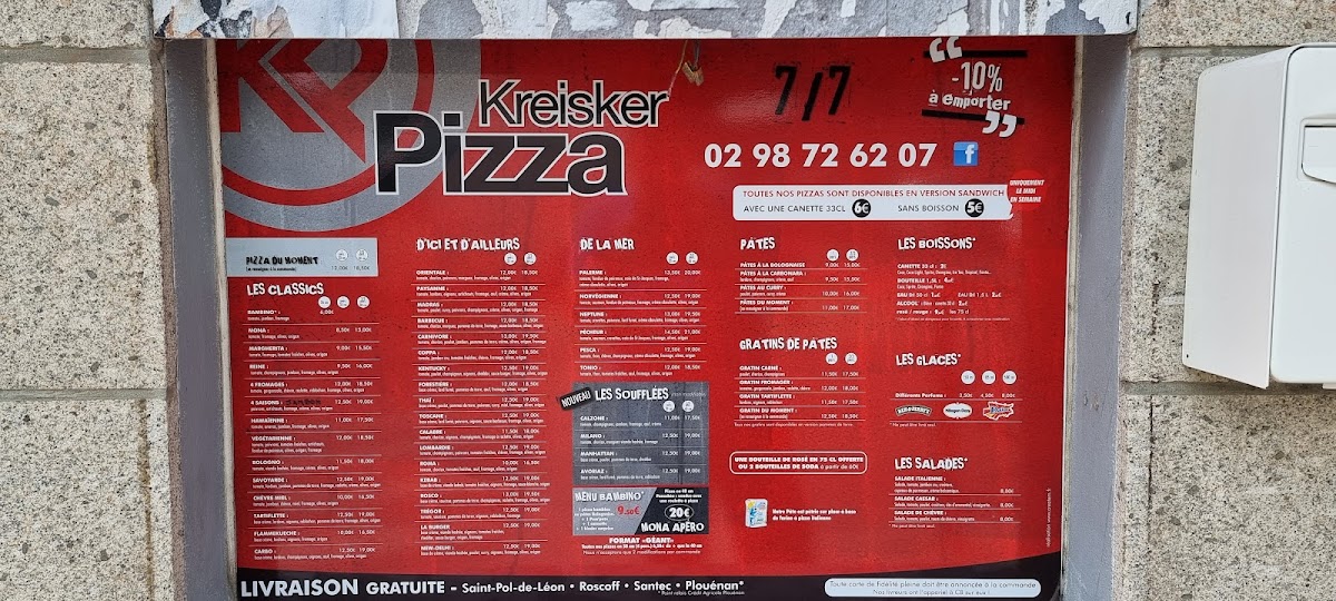 Kreisker Pizza offers a delightful selection of pizzas that are sure to satisfy any craving. One of the highlights is the Pizza Du Jour, which brings a refreshing surprise every day with its seasonal ingredients, keeping the menu exciting and diverse. For those looking for something rich and indulgent, the Pizza Tartiflette Avec Chorizo stands out with its creamy cheese, potatoes, and a spicy kick from the chorizo. The Pizza Carnivore is a meat lover's dream, packed with a hearty combination of various meats that will definitely hit the spot. If you prefer something with a touch of elegance, La Confite is a perfect choice, offering a more refined flavor profile with its tender confit duck. Lastly, the Pizza Reine Chorizo combines the classic flavors of a traditional Reine pizza with the added zest of chorizo, making it a must-try for anyone craving a twist on the classic. With these delicious options, Kreisker Pizza caters to a variety of tastes, ensuring a memorable dining experience for all.